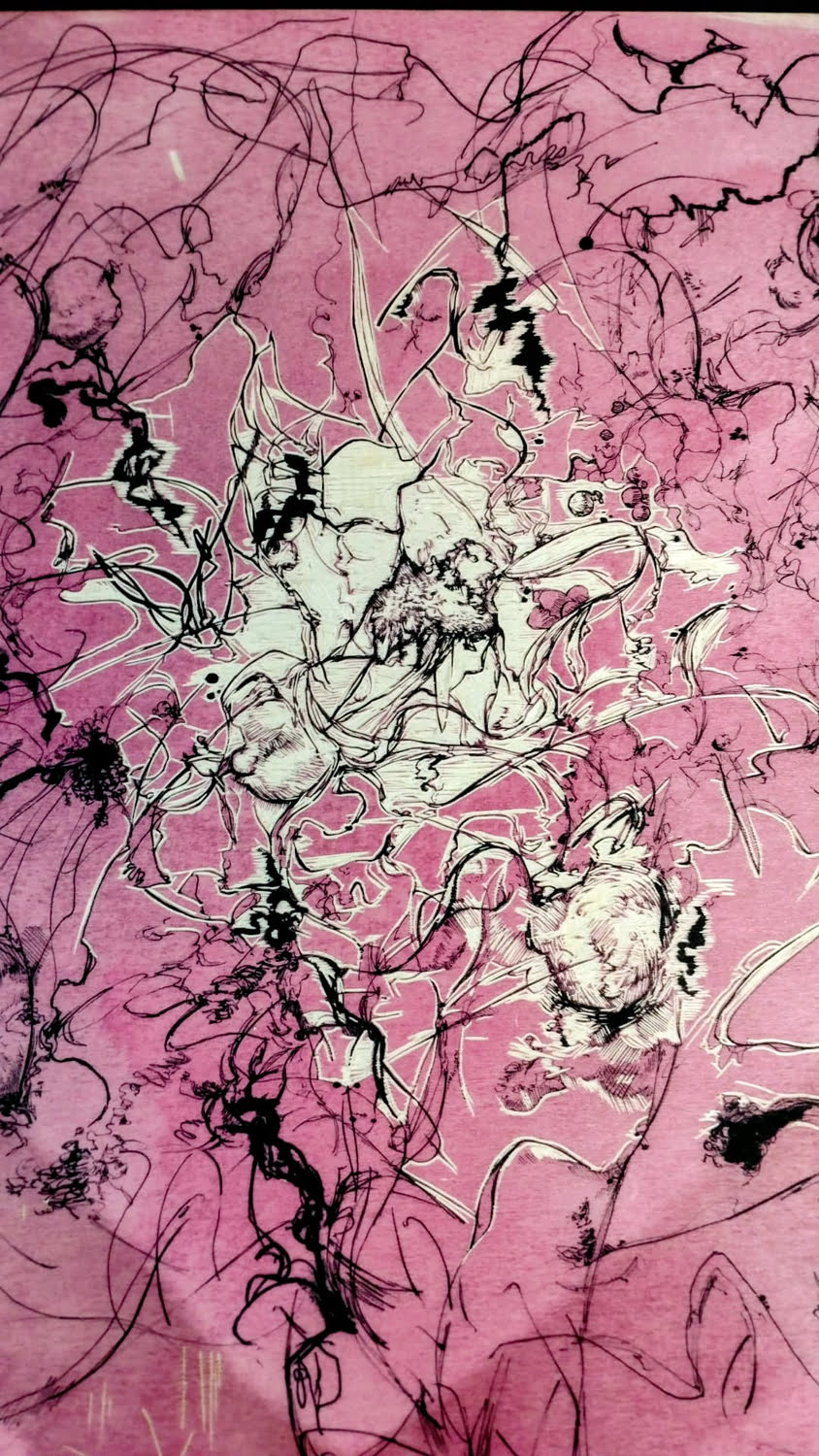 Je travaille essentiellement avec la gravure, le dessin, la peinture et la vidéo. Ce qui m’intéresse est la pluridisciplinarité et la recherche constante de nouveaux sujets à explorer dans ma pratique. Actuellement, mon travail se concentre sur l’idée de l’informe, à travers l’expérimentation de la matière et de la trace afin de produire des formes instables et indéfinissables.